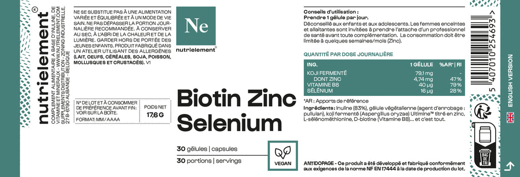Ce mix est composé de 3 actifs : la Biotine (vitamine B), le Zinc et le Sélénium (L-Selenomethionine).